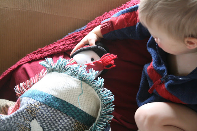 A few minutes ago, I saw Evan pick up the snowman from his perch and cuddle him in his arms. Evan started to croon to the snowman in the sweetest little voice as he walked into the living room: "Hi, Sowman! C'mere, nice Sowman. Awwww... Come sit on couch. Ah suggoh [snuggle] ah me..."